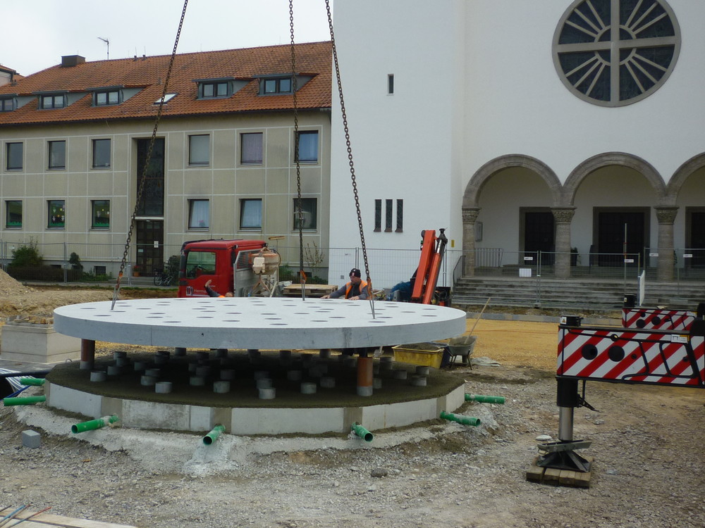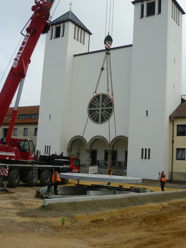 Montage einer tonnenschweren Brunnenplatte auf dem St. Michael-Platz in Neutraubling