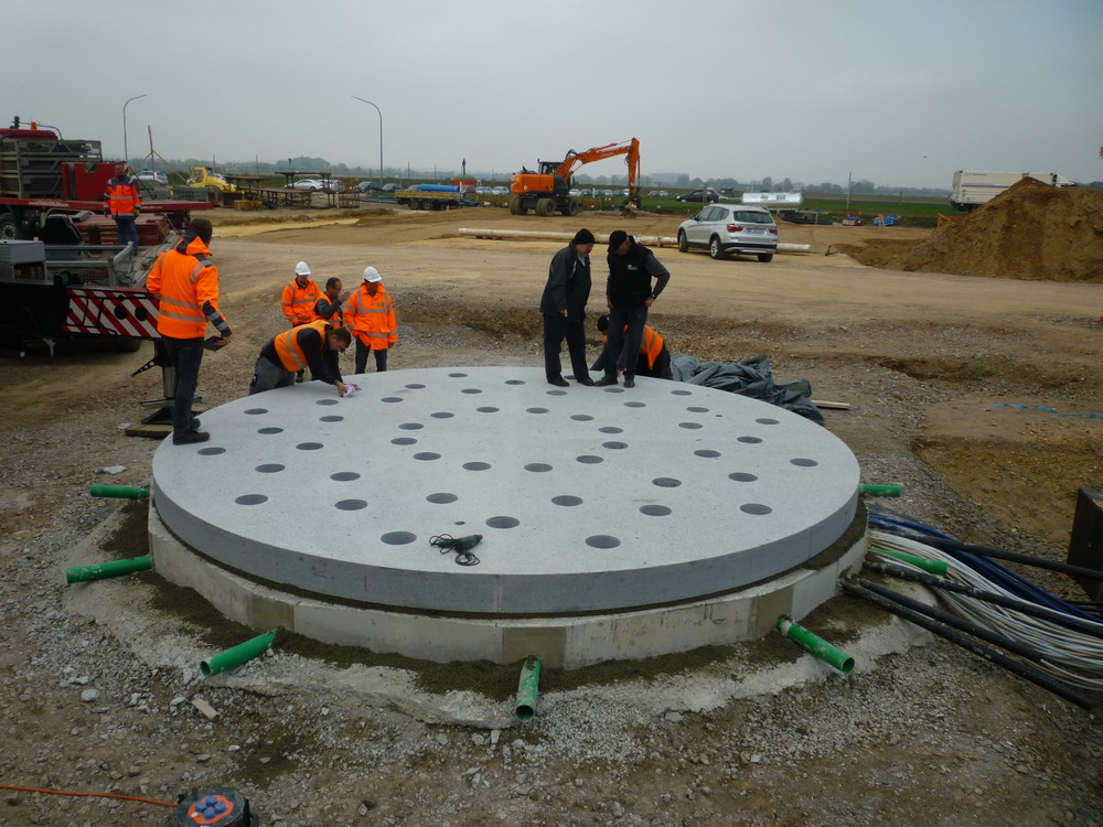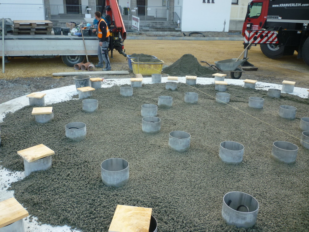 Seit Mitte dieses Jahres wird der Neutraublinger St.-Michael-Platz völlig neu gestaltet. Im Rahmen dieser Baumaßnahme haben wir, die Firma Herrmann Granit und Naturstein, den anspruchsvollen Auftrag erhalten, eine Brunnenplatte mit einem Gesamtdurchmesser von 6 Meter und einer Stärke von 25 cm zu fertigen. In die Platte wurden 48 Bohrungen eingebracht, die exakt auf die bereits vorbereiteten 48 Brunnendüsen millimetergenau angepasst werden mussten.