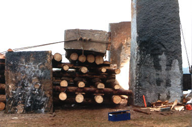 Am 23. Oktober 1995 hoben die Helfer den Querstein durch Hebelbewegungen zentimeterweise auf eine Bühne aus Baumstämmen.