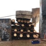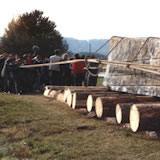 Er rollte dann über die im Abstand von knapp fünf Metern eingesetzten zwei Seitensteine. Zwischen diesen Seitensteinen befanden sich im Stapel der Baumstämme eine